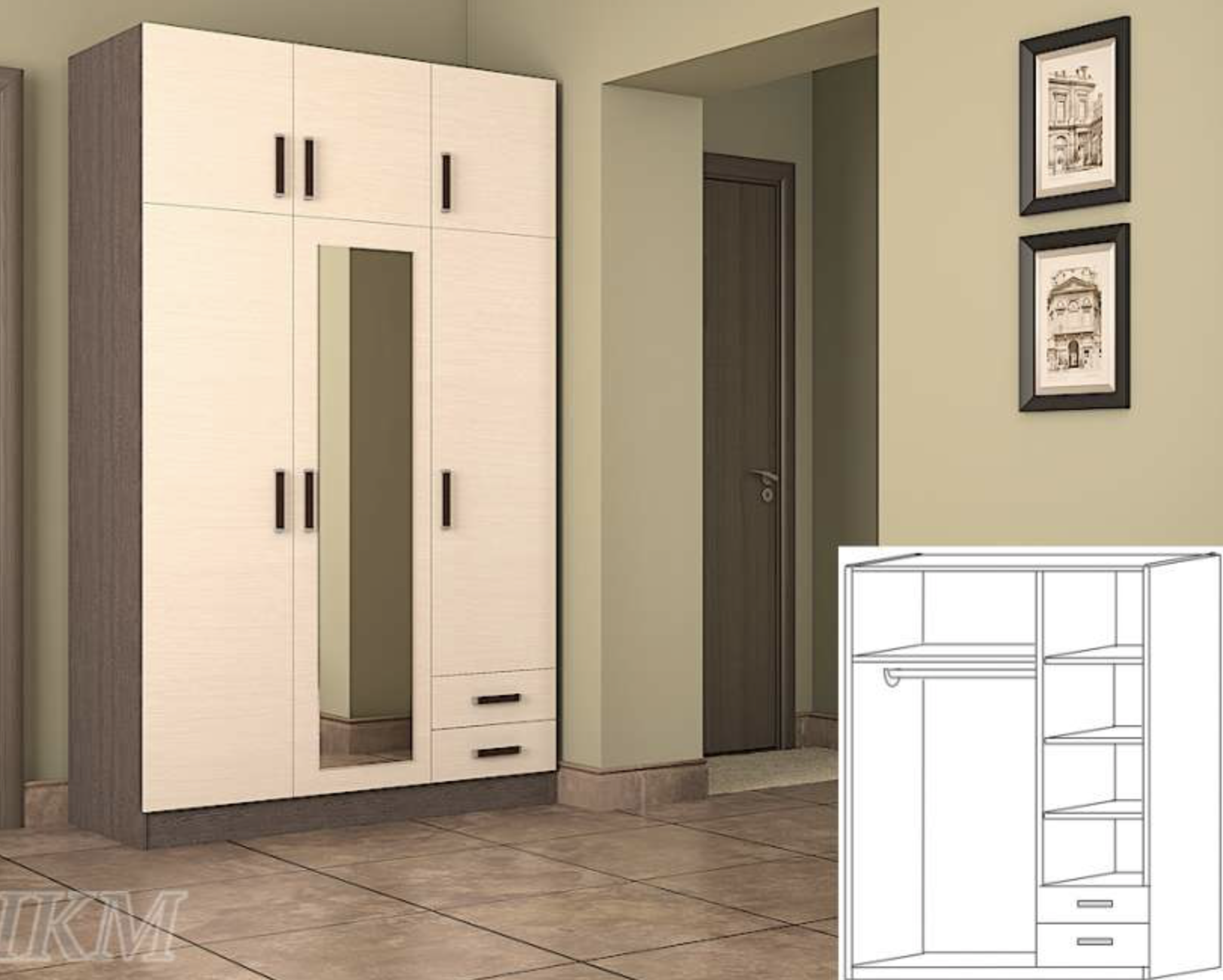 Шкаф трехстворчатый ШК-303 с зеркалом - за счёт продуманной внутренней эргономики такой вариант вмещает большое количество одежды, а также сэкономит бюджет семьи. Внутреннее содержимое: Штанга + Полки.